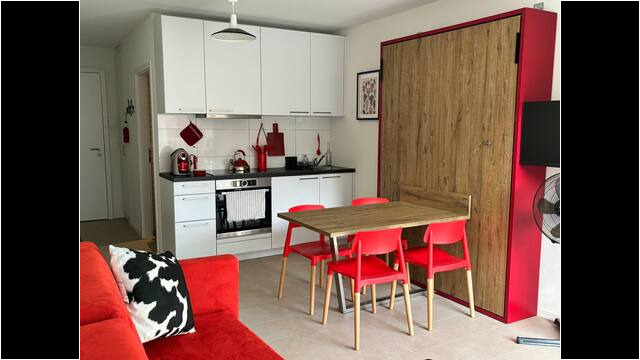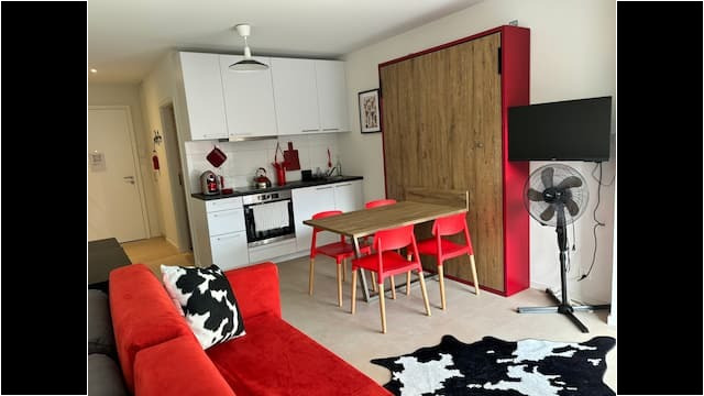 Bienvenue dans ce charmant studio suisse, soigneusement conçu pour accueillir jusqu’à quatre personnes dans un espace compact et polyvalent. Situé à quelques pas d’un arrêt de bus et à proximité de toutes les commodités essentielles, cet appartement offre un parfait équilibre entre confort et praticité.