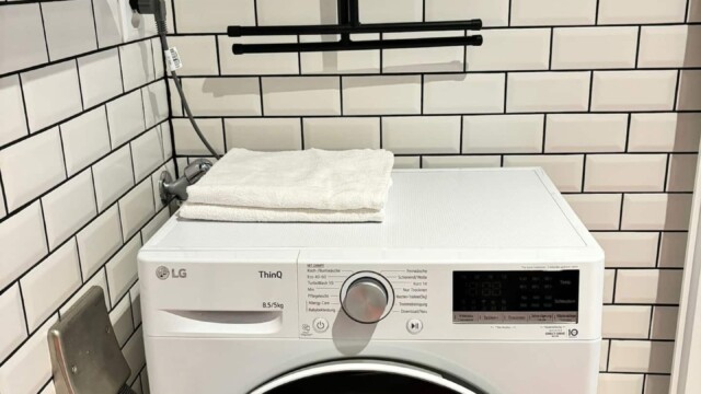 La salle de bain est entièrement équipée avec une douche, et l’appartement dispose d’un lave-linge et d’un sèche-linge – un confort rare en Suisse, vous permettant de rafraîchir facilement vos vêtements pendant votre séjour.