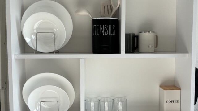 A full-size fold-out table provides access to the crockery. The room is equipped with an induction cooktop for preparing full meals, as well as a microwave and an air fryer to support various cooking needs. You’ll also find a refrigerator with a small freezer compartment and a TV with Amazon Prime (guests may log in to their own streaming services). Private WIFI included.