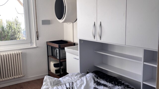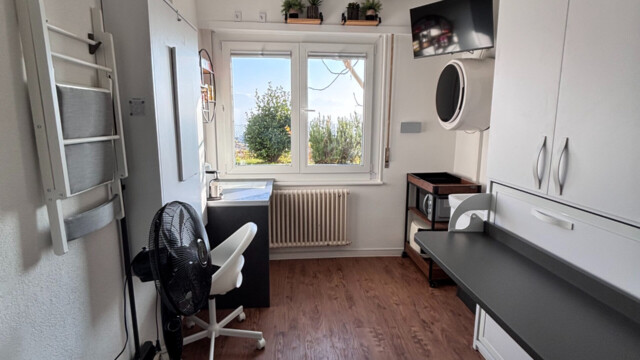 An incredible room equipped with everything needed for a comfortable stay. The dedicated workspace features an office chair and a clever fold-out bed with plenty of shelving. The mattress size is 180 x 90 cm. Believe it or not, this room even includes its own wall-mounted washing and drying machine—a rarity in Switzerland. After washing, laundry can be hung on extendable drying wires.